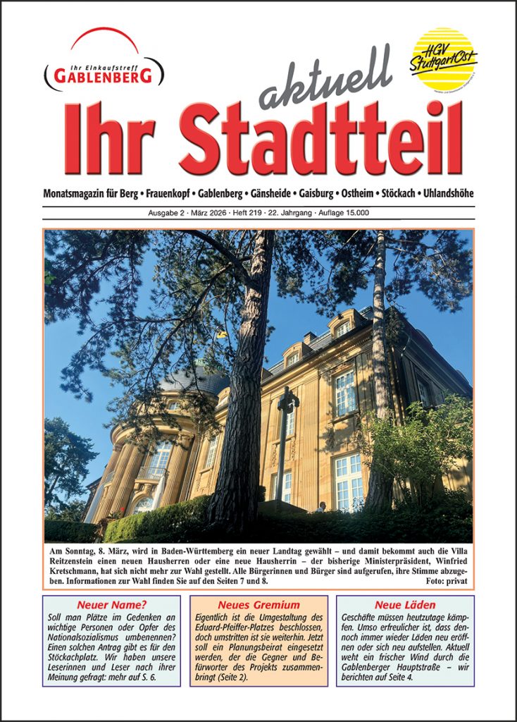 UND! Sie bestimmen mit, was wir redaktionell präsentieren können. Ihre wertgeschätzten Beiträge und Inserate sichern den Bestand Ihres und unseres wertvollen Informations-Stadtmagazins. Danke dafür! 15.000 Leser plus Mitleser warten jeden Monat auf ihr „Blättle“ und saugen es auf! Demnächst auch online und jetzt auch in der Auslage von zahlreichen Geschäften in Stuttgart-Ost kostenlos erhältlich!